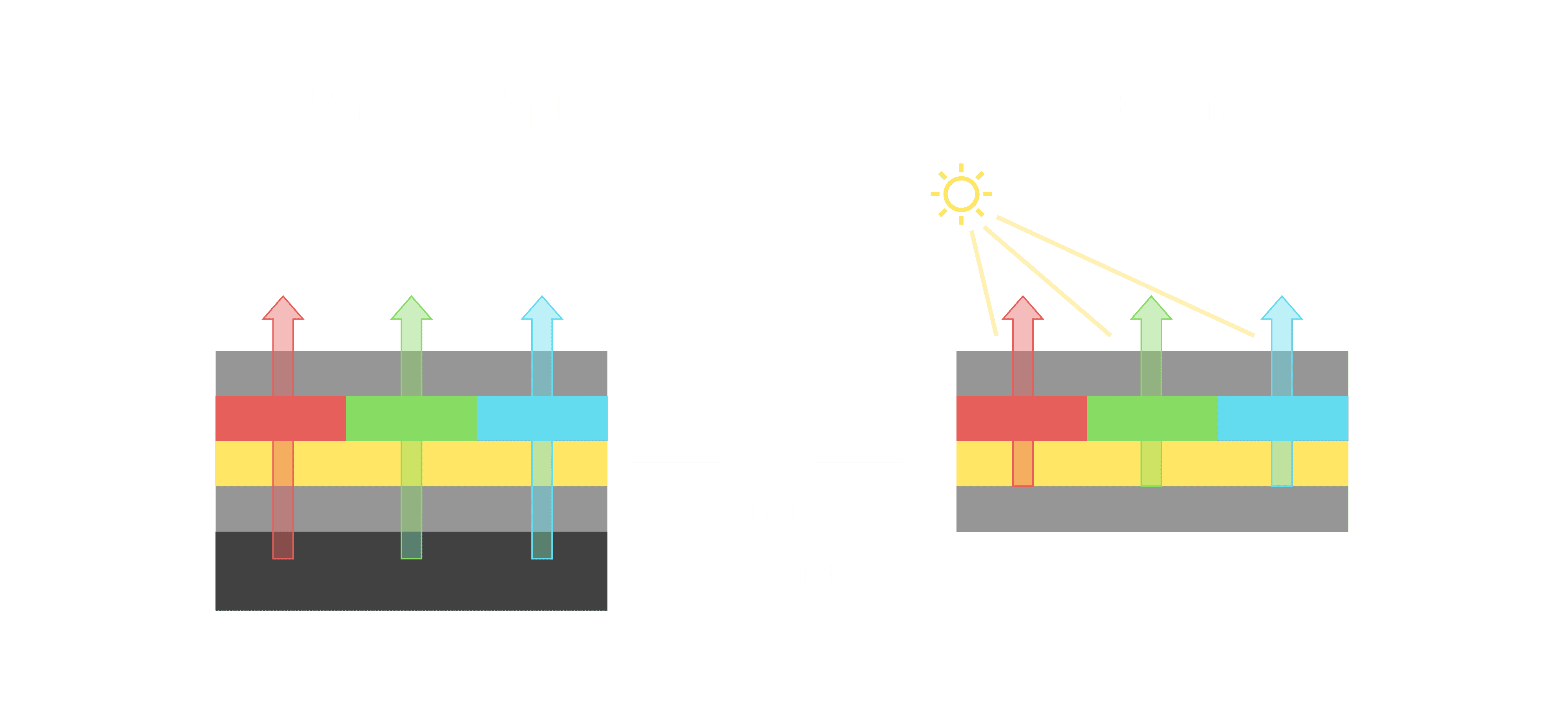 与传统需搭配背光单元的液晶显示相比,,,,反射式液晶技术不仅更省电、、、、更轻薄,,,,且即便在艳阳下仍能清晰显示。。此外,,,,少了背光单元,,,,也大幅降低了 LED 蓝光伤害眼睛的疑虑。。。